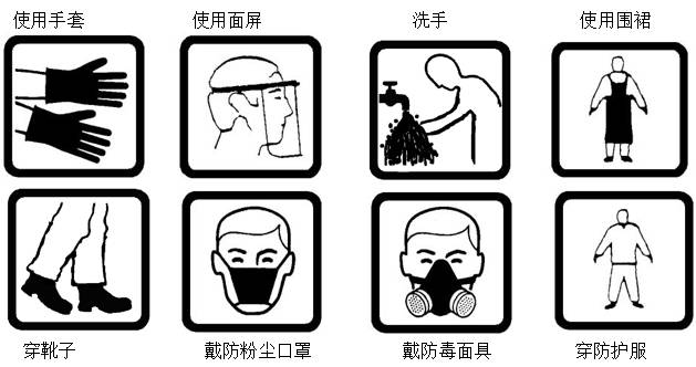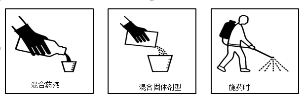 每種產(chǎn)品標(biāo)簽都會(huì)說(shuō)明在測(cè)量/混配和施藥時(shí)需要的防護(hù)裝備,這些信息會(huì)以象形圖來(lái)展示為了幫助所有產(chǎn)品使用者可以完全理解,在以下圖示操作時(shí)的防護(hù)要求。