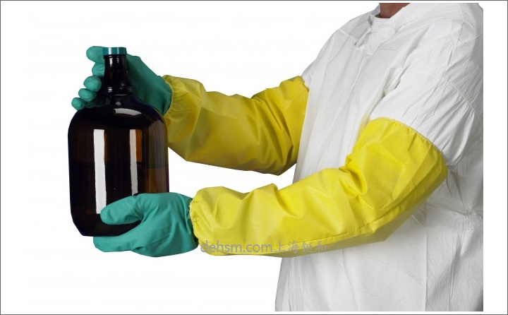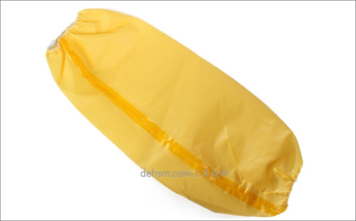 防化袖套采用亮黃色高密度聚乙烯膜,熱合膠帶封邊,整個(gè)袖長(zhǎng)45厘米,可以有效化學(xué)品傷害。