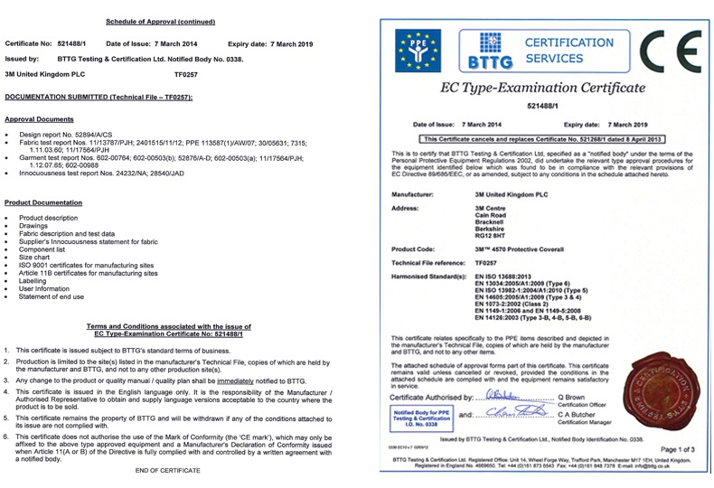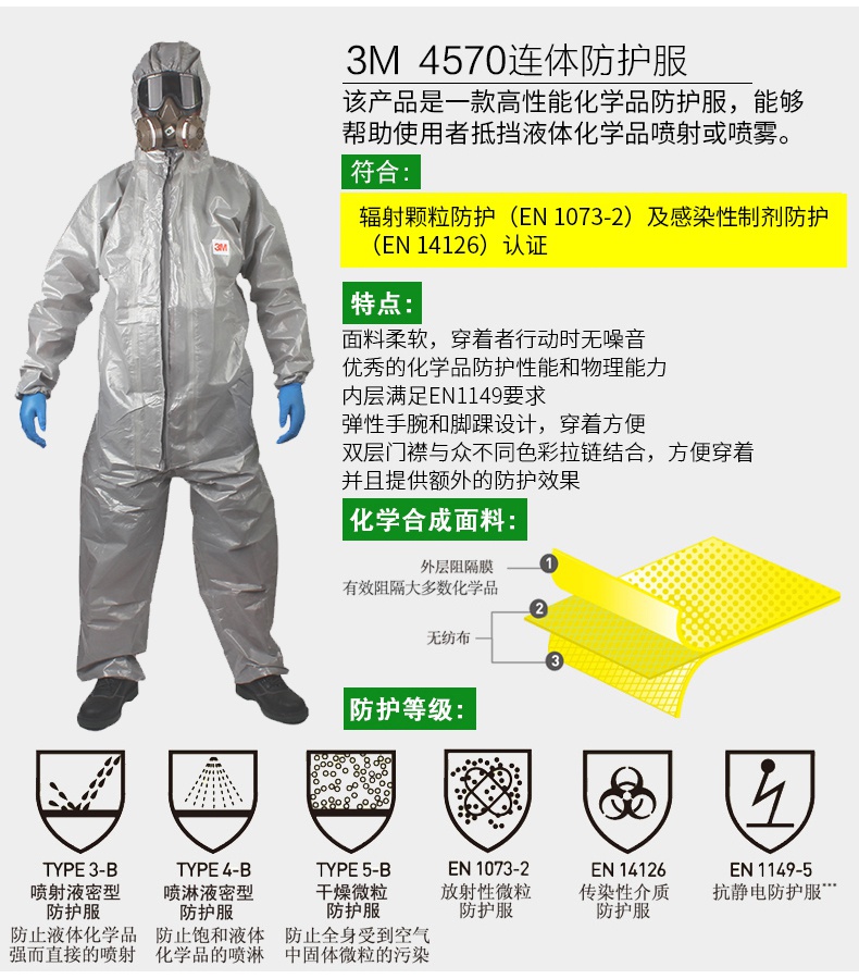 3M4570防護服為接觸化學(xué)環(huán)境的工人提供化學(xué)保護和機械強度。該防護服有助于防止危險粉塵(5類)、輕液飛濺(6類)、低壓液體噴霧(4類)和高壓液體噴射(3類)。經(jīng)認證它也可防放射性粒子(EN1073-2)和(EN14126)。3M4570連體防化服有助于防止一系列化學(xué)噴射和噴霧。該化學(xué)防護服已通過3/4/5/6級防護等級認證。其他的設(shè)計特點包括放大的拉鏈和拇指環(huán)、一個集成的雙向關(guān)閉門襟系統(tǒng)和胸巾,方便使用的同時不會影響防護等級。