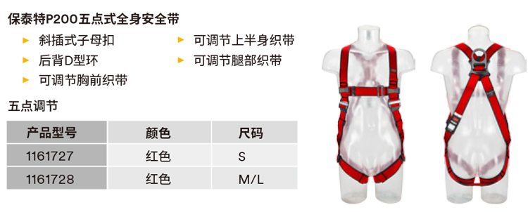 3M1161728保泰特P200五點式全身式安全帶包含合金鋼背部D型環、安全繩掛扣、穿過式帶扣和彈簧式上身調節;