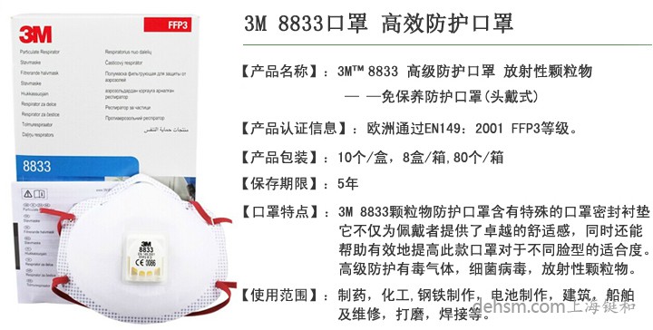 3M8833防毒口罩是高毒和放射性顆粒物防護口罩,高毒和放射性顆粒物防毒口罩。3m8833口罩帶呼氣閥設(shè)計的耳戴式白色防毒口罩,符合中國KN95標準,同時獲得歐洲FFP3認證,過濾效率大于95%。